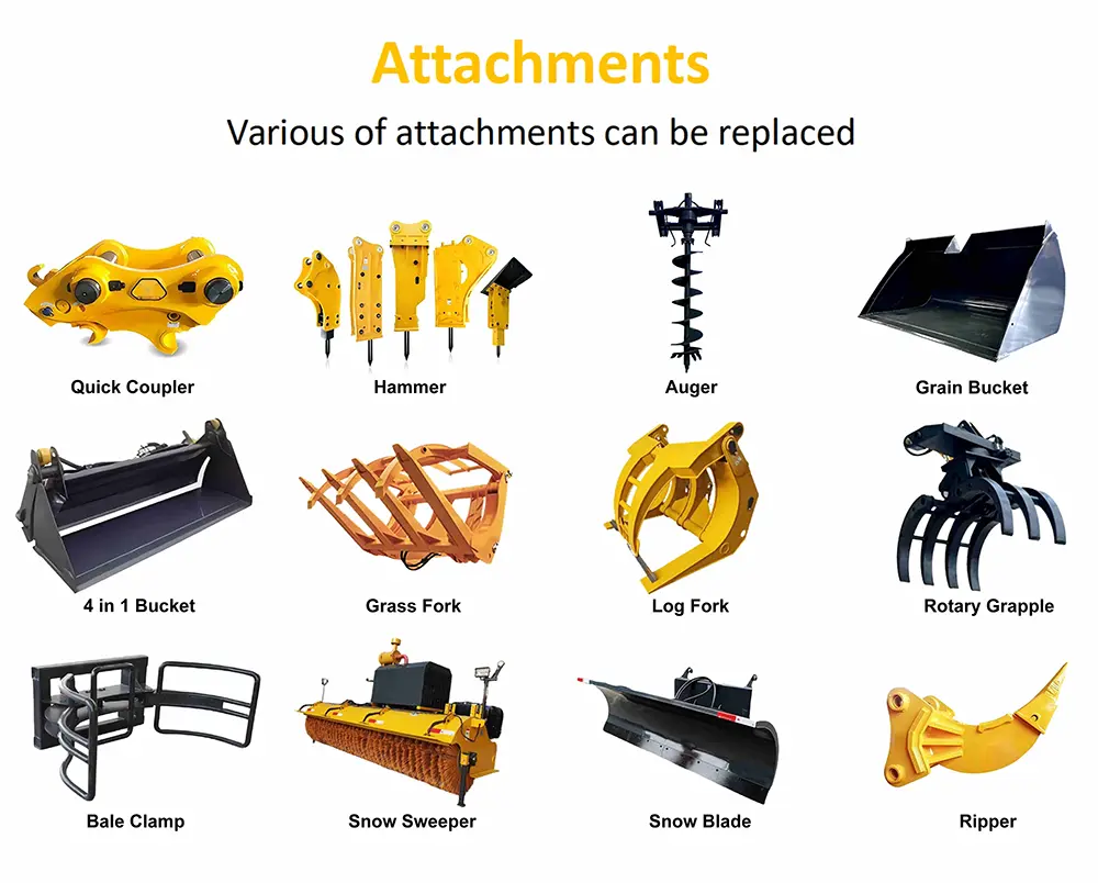 Цей великий навантажувач пропонує кілька варіантів робочих пристроїв, включаючи ковші для каміння, ковші для вугілля, ковші для бічного розвантаження та інші аксесуари. Завдяки швидкозмінним шарнірам він може перемикатися протягом 3 хвилин, справді досягаючи багатофункціональності для однієї машини. Для особливих умов роботи можна вибрати спеціалізовані пристрої, такі як захвати для деревини та різаки для трави, щоб задовольнити різноманітні експлуатаційні потреби лісового господарства, сільського господарства та інших галузей промисловості. Кілька запасних портів клапанів зарезервовано для гідравлічної системи для полегшення майбутнього функціонального розширення. Стандартний допоміжний гідравлічний трубопровід може приводити в рух різні гідравлічні інструменти, розширювати сценарії використання обладнання та поширюватися від традиційних земляних робіт до кількох сфер, таких як муніципальне та логістичне забезпечення, максимізуючи повернення інвестицій.