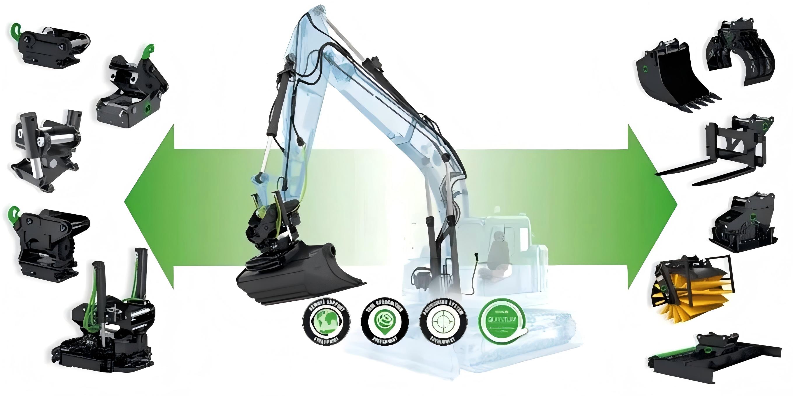 Гідравлічний інтегрований модуль: обертається швидке з'єднання, розроблене Kyungwontech у Південній Кореї, вбудовує механізм передачі між верхньою та нижньою компонентами для досягнення 360 градусів обертання аксесуара. Наприклад, екскаватор гусениць, оснащений обертовим відром, може нахилятися бічно на 65 градусів, щоб обрізати схили без необхідності повторних налаштувань тіла.